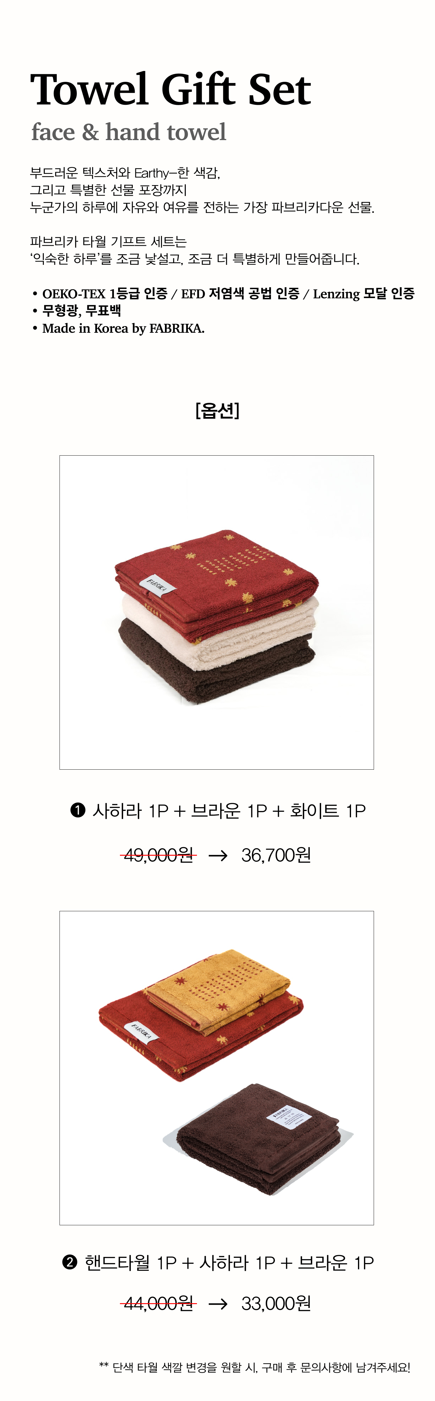 ➋ 핸드타월 1P + 사하라 1P + 브라운 1P - 44,000원 > 33,000원