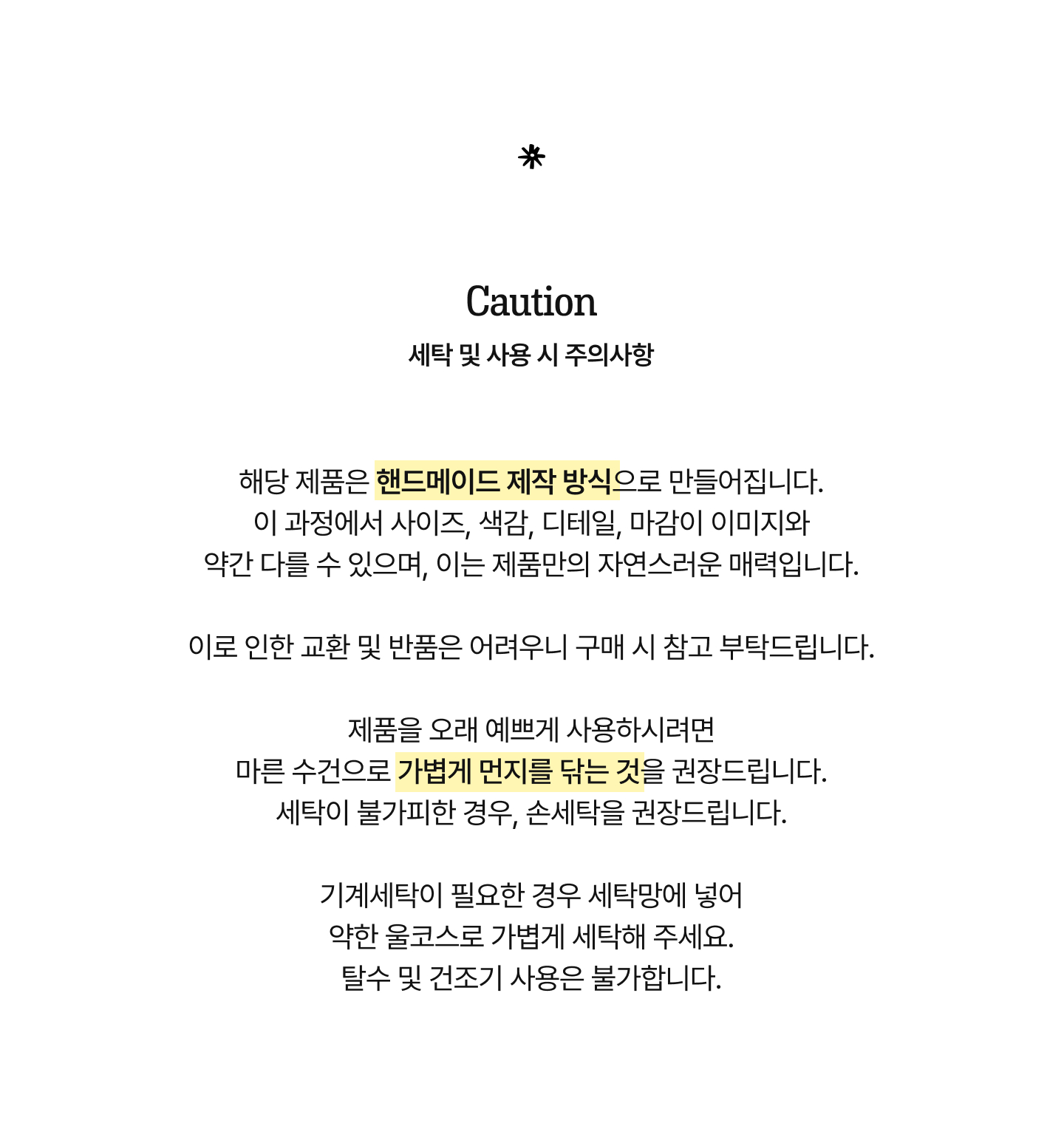 *제품을 오래 예쁘게 사용하시려면 손세탁을 권장드립니다. 기계세탁이 필요한 경우 세탁망에 넣어 약한 울코스로 가볍게 세탁해 주세요. 탈수 및 건조기 사용은 불가합니다.
